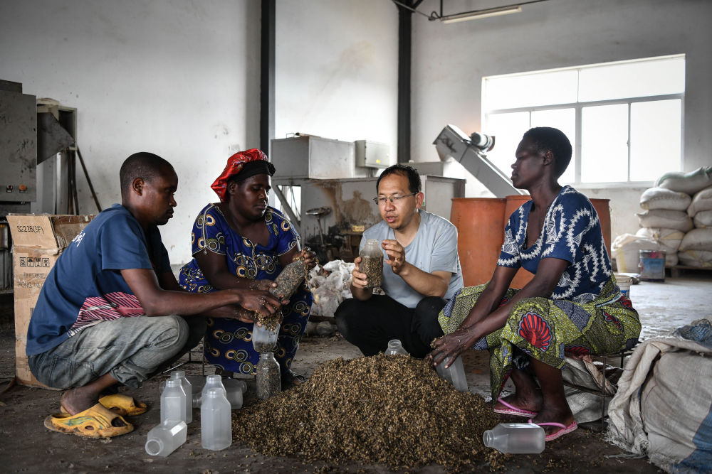 2024年8月13日,在盧旺達南方省胡耶區的中國援盧農業技術示范中心,菌草專家陳曉斌(右二)與當地農民一起制作菌種培養料。新華社記者 韓旭 攝Efv安康新聞網