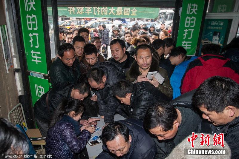 2014年2月19日,杭州,隨著“嘀嘀”、“快的”兩家打車軟件的“燒錢”競賽愈演愈烈,眾多出租車司機來到兩家打車軟件公司的杭州服務點,排隊安裝司機版軟件。司機們表示,安裝打車軟件,一是為了緊跟潮流方便做生意,二是可以得到更多的“獎勵”補貼。