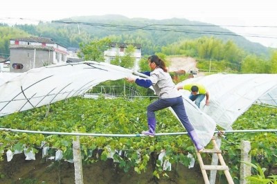 臺風“蘇迪羅”造成福安多個鄉鎮的葡萄園進水、大棚損壞。圖為連日來,松羅鄉尤沃村果農加緊搶修葡萄園避雨大棚。何小麗 鄭祖輝 攝“蘇迪羅”卷走福……