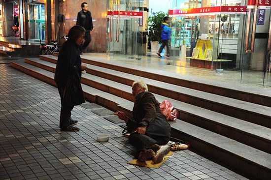 2013年11月4日,蘇州某地街頭,乞討人員在新華書店前“交流”心得。 東方IC 圖職業乞討人員每天的收入大約能有四五百元,每月的收入起碼過萬;救助站工作人員甚至……