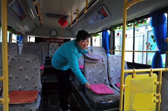 11月4日,司機正在安裝暖坐墊。中新社發 于海洋 攝11月4日,乘客坐在安放有暖坐墊的公交車。中新社發 于海洋 攝當日,在沈陽230路公交車上,每個座位上都配備了一……