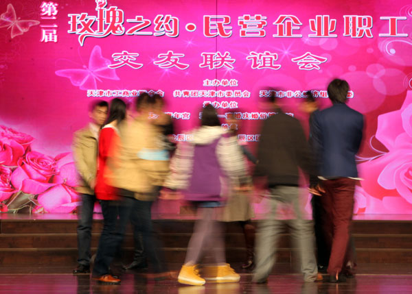 11月10日,前來相親的青年男女手牽手參與互動游戲——“桃花朵朵開”。當日,天津市“第二屆玫瑰之約·民營企業職工交友聯誼會”在天……