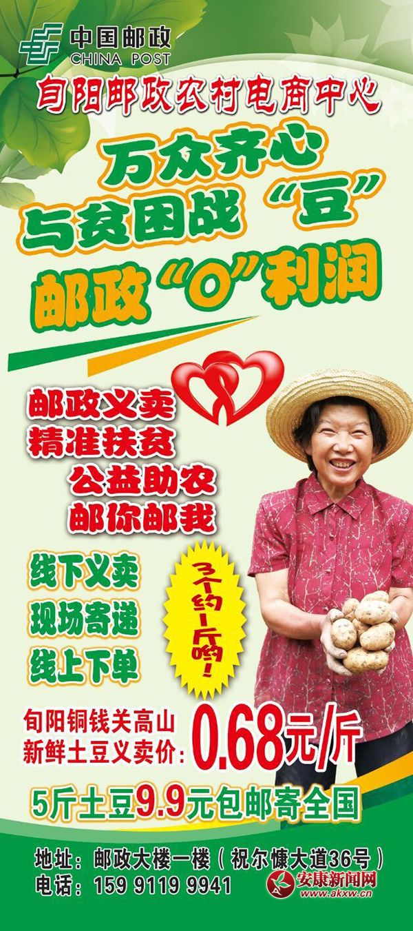 進村高價回收、線下低價義賣:旬陽郵政公司已經與銅錢關鎮黨委、鎮政府對接聯合,赴沙陽河村收購高山新鮮土豆0.70元/斤,現場義賣0.68元/斤。對,你沒有看錯,真正的高價收購,低價義賣,只為貧困戶的勞動有尊嚴。定于2018年7月1日8點30分至晚上8點,在旬陽郵政大樓一樓農村電商運營中心開展“助力農戶脫貧暨愛心匯聚銅錢關土豆義賣活動”。