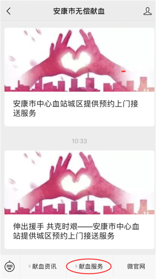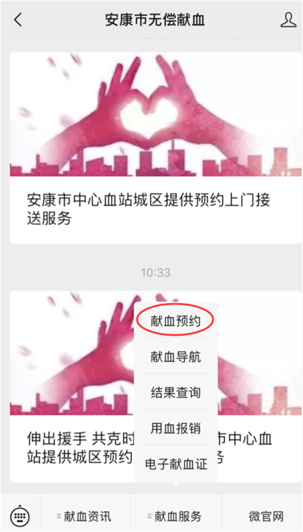 同時安康市中心血站公眾號開放獻血預約渠道,(如圖示)在關注安康市無償獻血公眾號后,在最下方菜單欄選擇“獻血服務”——“獻血預約”——填寫相關信息,便可完成預約。Pbi安康新聞網