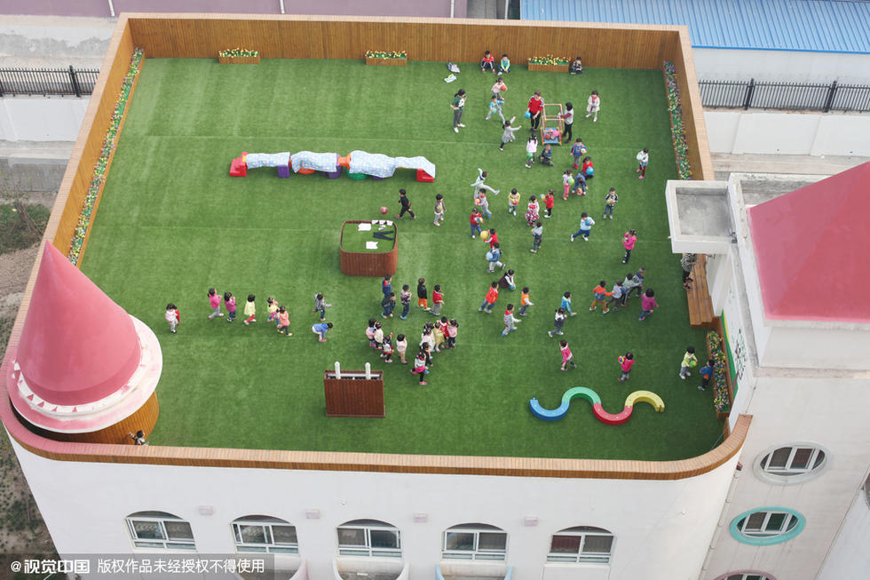 2015年10月20日,陜西省西安市西影路一幼兒園的小朋友們在屋頂操場打球,翻跟斗,做游戲,捉迷藏…… 玩夠了,跳累了,躺在屋頂曬太陽。漂亮安全的屋頂操場成了孩子們的最愛。XHj安康新聞網
