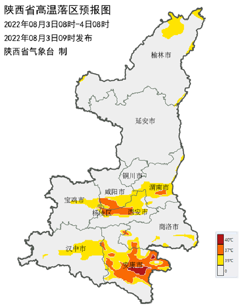 2022年8月3日10時00分,陜西省氣象臺發布高溫黃色預警 :受大陸高壓影響,3日榆林北部、關中大部、陜南大部地方有35℃以上的高溫天氣,其中咸陽南部、楊凌、西安大部、渭南南部、漢中東部、安康部分地方可達37℃以上,安康平原地區局地可達40℃以上。