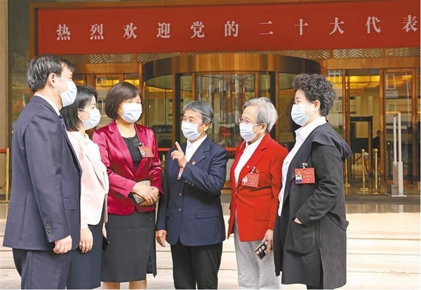 十月十四日,出席黨的二十大的陜西代表王友民、何菲、常亞瓊、張蓮蓮、路生梅、王照輝(左起)在住地交流履職感想。代表們一致表示,將堅決扛起政治責任,以飽滿的熱情認真履行好神圣職責。