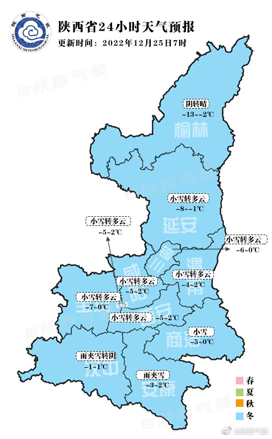 據陜西氣象最新預報,今天白天:榆林、延安北部陰天轉多云,延安南部、關中北部有小雪,局地有中雪。陜南中西部有雨夾雪或小雪。關中南部、陜南東部有小到中雪,寶雞南部局地、西安南部局地、渭南南部局地、商洛北部局地、秦巴山區局地有大到暴雪。陜北西部、關中西部、陜南中西部、秦巴山區日平均氣溫下降 4-6℃。陜北有 4-5 級偏北風。早上關中中西部、陜南西部、秦嶺山區有輕霧。