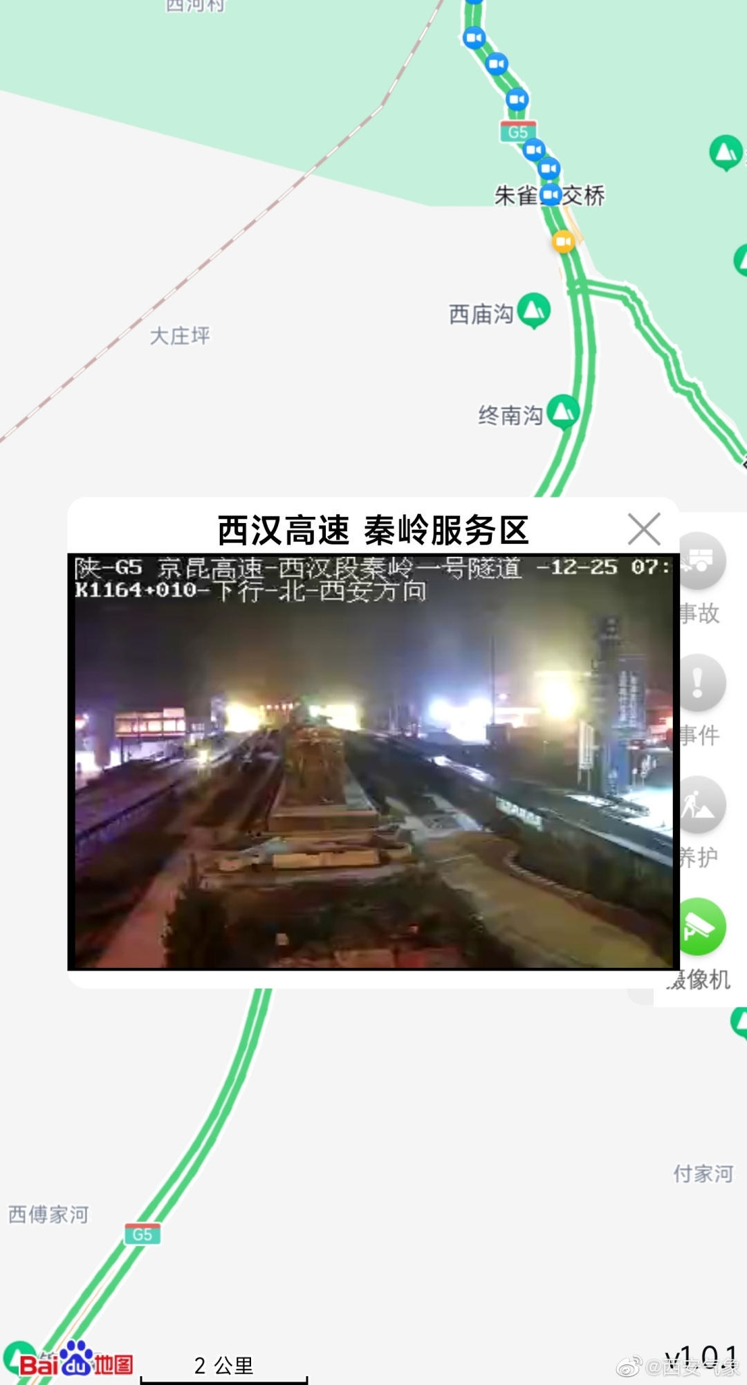 繞城高速全線暢通;福銀高速藍商段山區中雪;滬陜高速西商段山區中雪 ;京昆高速西漢段山區中雪;包茂高速西柞段山區中雪;轄區內其余路段均通行正常。