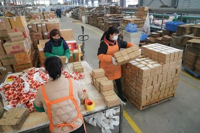 2月6日,陜西美農網絡科技有限公司的工人在物流倉內打包食品快遞包裹。(新華社記者邵瑞 攝)