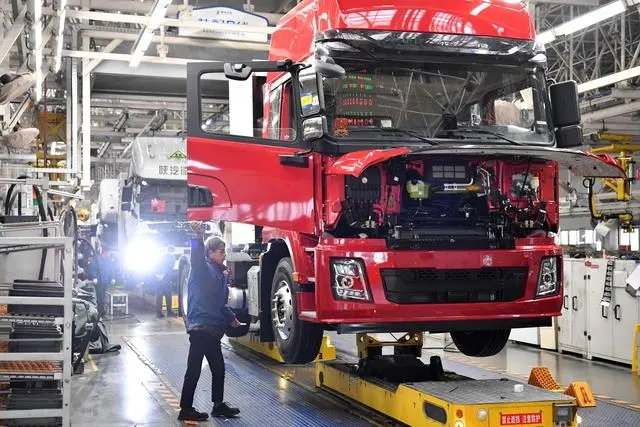 工業機器人揮舞長臂,工人在生產線上緊張忙碌。在位于西安經開區涇渭新城的陜汽控股集團,總裝車間正馬力全開,每6分鐘就有一輛整車從這里下線。