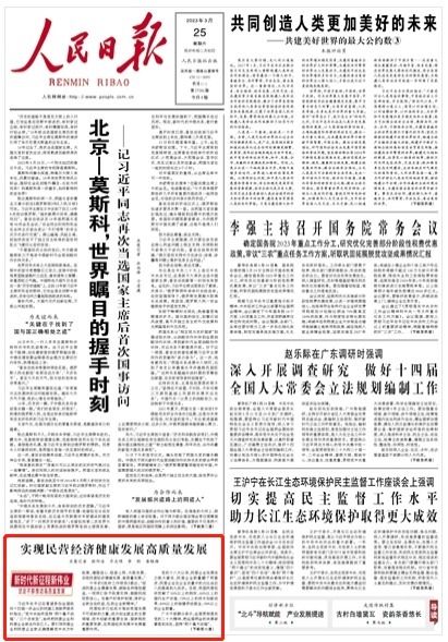 3月25日,《人民日報》頭版刊發(fā)文章《實現(xiàn)民營經(jīng)濟健康發(fā)展高質量發(fā)展(新時代新征程新偉業(yè)·堅定不移推動高質量發(fā)展)》,其中聚焦陜西民營經(jīng)濟發(fā)展。
