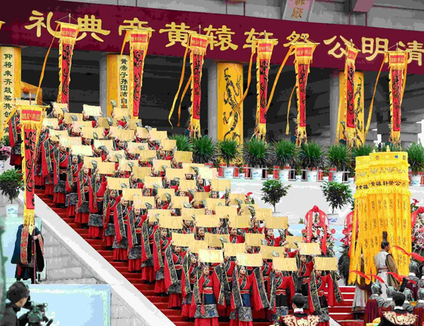 鼓聲雄渾,鐘鳴悠遠。擊響的34通鼓聲,象征著全國34個省、自治區、直轄市,香港、澳門特別行政區和臺灣地區,以及海內外中華兒女崇敬初祖的共同心聲;9響鐘鳴,代表了中華民族傳統禮儀的最高禮數,表達全體炎黃子孫對人文初祖軒轅黃帝的無限景仰和無比感恩!饵S帝頌》響徹全場,拉開典禮大幕。