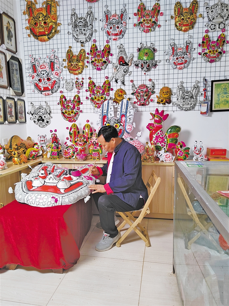 2023年12月31日,寶雞市鳳翔區城關鎮六營村處處彰顯著濃郁的民俗文化韻味。記者跟隨胡滿科走進他的泥塑工坊,只見墻上掛滿了臉譜、虎頭、牛頭等掛片泥塑,桌子上的立人泥塑栩栩如生;幾名村民分散坐在屋內,專注于自己的那道工序。