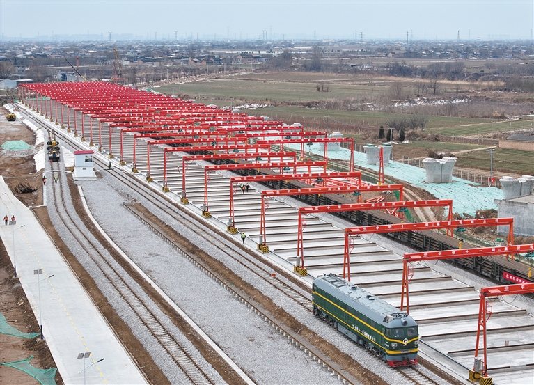 1月21日,中鐵十一局西延高鐵閻良鋪軌基地(無人機照片)。 當日,隨著一列運載500米長鋼軌的列車駛入中鐵十一局西延高鐵閻良鋪軌基地,西(安)延(安)高鐵進入存軌施工階段,為后續鋪軌工作奠定基礎。項目建成后,西安至延安的運行時間將從目前的2.5小時縮短至1小時左右。 新華社記者 張博文攝