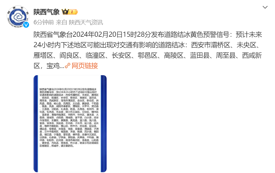 陜西省氣象臺2024年02月20日15時28分發布道路結冰黃色預警信號,預計未來24小時內下述地區可能出現對交通有影響的道路結冰: