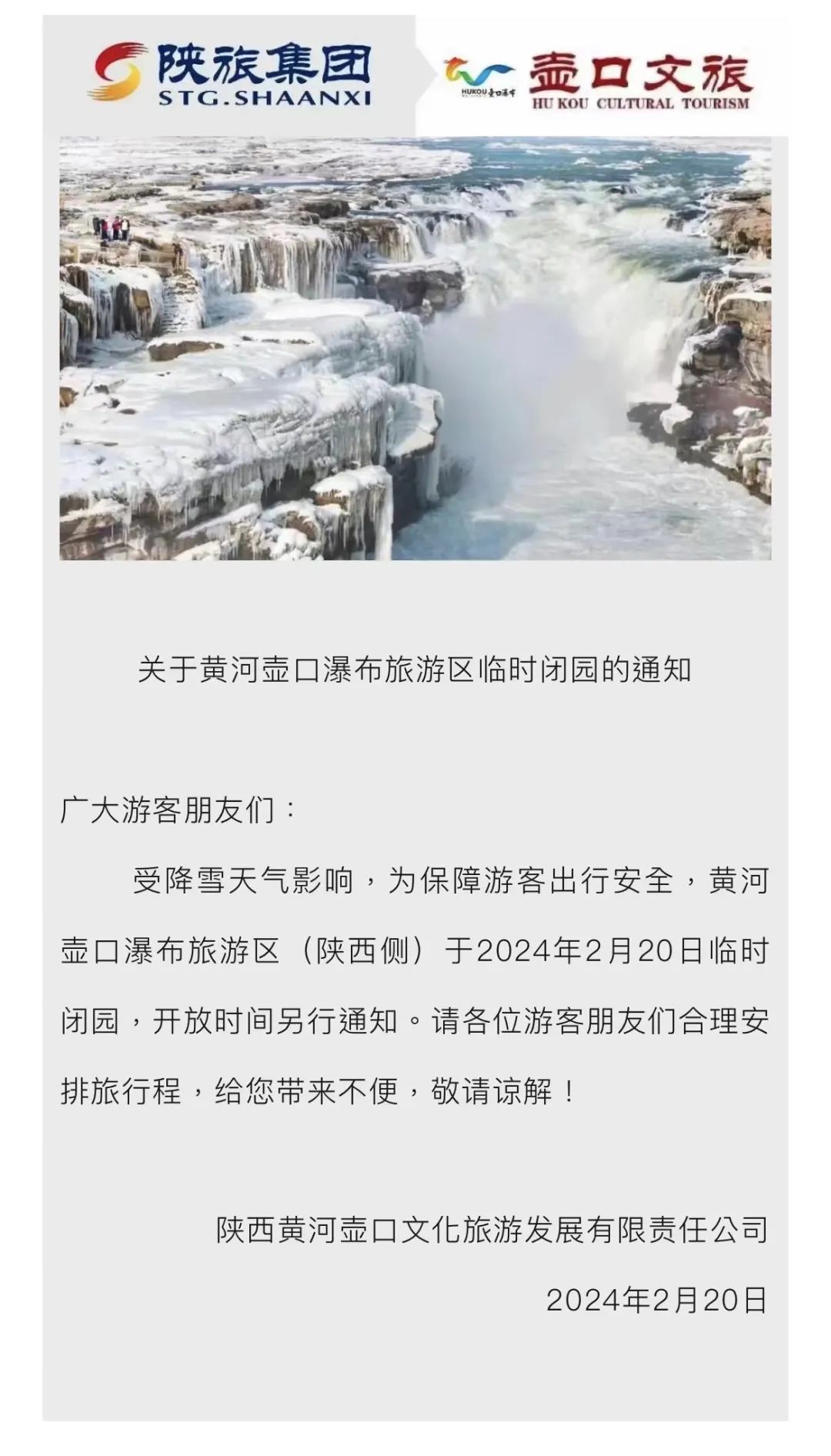 黃河壺口瀑布旅游區臨時閉園:受降雪天氣影響,為保障游客出行安全,黃河壺口瀑布旅游區(陜西側)于2024年2月20日臨時閉園,開放時間另行通知。請各位游客朋友們合理安排旅行程,給您帶來不便,敬請諒解!