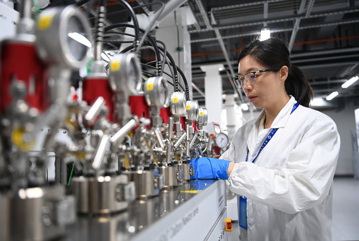 工作人員在榆林中科潔凈能源創新研究院工藝放大平臺實驗室制備催化劑小試樣品(2024年3月6日攝)。新華社記者 鄒競一 攝
