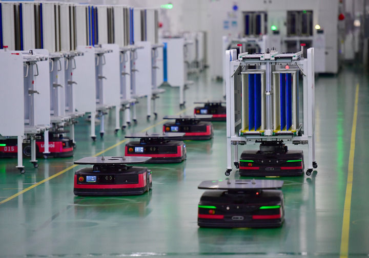 智能搬運機器人在隆基單晶硅太陽能電池工廠內工作(2024年3月6日攝)。新華社記者 邵瑞 攝