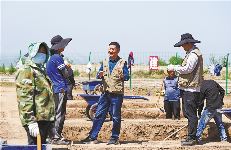 4月26日,錢耀鵬(左三)在陜西旬邑西頭遺址與工作人員交流。 記者 王熙攝