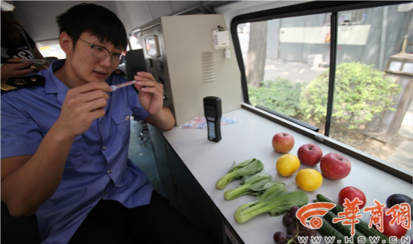 西安市雁塔區食品藥品監督管理局,工作人員正在對水果表皮上的潔凈度進行檢測。華商報記者 黃利健 攝買來的水果直接用清水洗就可以吃了嗎?哪種方式清洗水果最好……