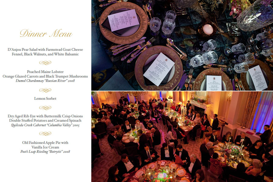 本次晚宴主打菜肴包括水煮緬因州龍蝦、脫脂乳酥洋蔥配干式熟成肋眼牛排等,甜點(diǎn)包括蘋果派和香草冰淇淋;酒是2008年產(chǎn)的“俄國河”酒和2005年產(chǎn)的“哥倫比亞峽谷”酒。RH7安康新聞網(wǎng)