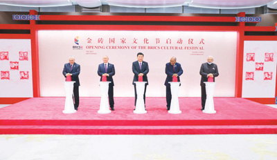 同日,金磚國家領導人共同出席金磚國家文化節啟動儀式暨文化圖片展。習近平和其他金磚國家領導人在各國印章柱上按下印章,對面屏幕上同時顯示出金磚國家中文國名篆刻印文,共同啟動文化節開幕式。隨后,五國領導人共同參觀金磚國家文化圖片展,并觀看金磚國家首部合拍影片《時間去哪兒了》片花。