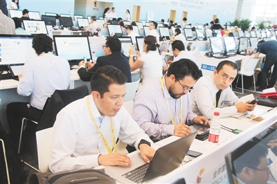 | 9月5日,第九屆金磚國家領導人廈門會晤閉幕,外國媒體積極報道會議進程。圖為5日,來自墨西哥的多家媒體記者正在新聞中心忙碌。 |