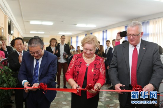 中國駐白俄羅斯大使館臨時代辦羅占輝(左)、白俄羅斯第12中學校長佩特魯莎(中)和白俄羅斯教育部長卡爾邊科共同為中國文化與文字中心剪彩。新華社記者魏忠杰攝Ttc安康新聞網