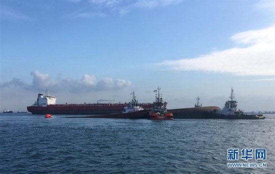 9月13日,四艘拖船將部分淹沒的挖沙船轉移至新加坡安樂島附近海域,以便進行水下搜索活動。新華社發(新加坡海事及港務管理局供圖)