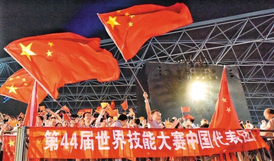 | 圖為日前在阿拉伯聯(lián)合酋長國舉行的第44屆世界技能大賽開幕式上,人們揮舞著中國國旗歡迎中國代表團入場。 |