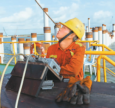 | 7月30日,在肯尼亞拉穆港,工作人員在中國(guó)交建“粵工樁11號(hào)”施工船上工作。 |