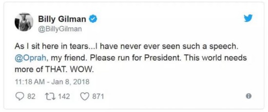 Billy Gilman:我現在坐在這兒淚流滿面……我從來沒聽過這樣的演講,奧普拉,我的朋友,請競選總統吧,這個世界需要更多這樣的聲音。TEN安康新聞網