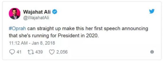 Wajahat Ali:奧普拉可以直接把這次演講當做宣布參選2020年總統競選的演講。TEN安康新聞網