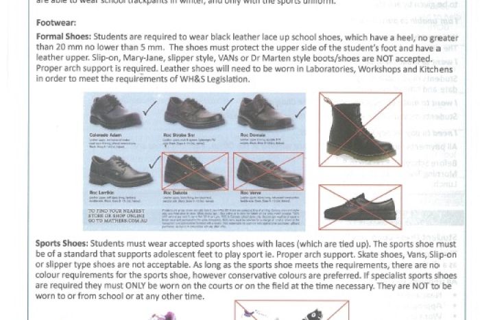 據悉,學校規定,學生必須穿黑色系帶皮鞋,鞋跟必須在5毫米到20毫米之間,并發布了圖片說明鞋子的標準和零售商。