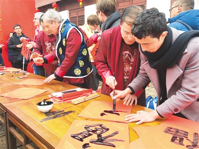 在這次體驗活動的現場,不僅有查理這種第一次來到中國的國際友人,也有像夏波波這樣在中國已經待上一段時間的老朋友。來到中國一年半,夏波波坦言,“我住在廣州市中心區域,平時見不到這么多有意思的傳統事物。來到青田,才第一次見識了中國傳統的新年。”高高掛起的紅燈籠、門楣上貼著的紅對聯,還有各式口味的地方小吃,都讓他感到無比新奇。“第一次寫對聯有點難,但是我寫得很開心。中國的新年很熱鬧,你看,這里的所有人都玩得很開心,我喜歡這樣的氛圍。”