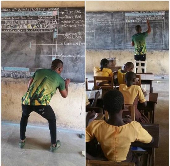 據英國《每日郵報》3月1日報道,近日,一位加納中學老師在臉書上分享的“獨門”教學照片帖子走紅網絡。據悉,由于他所任教的中學沒有電腦設備,所以他只能使用彩色粉筆不辭辛苦地將電腦屏幕的一個個頁面繪制到黑板上進行教學。他給學生在黑板上畫圖講解如何使用微軟Word的照片發出后,這位老師獲得了全球的贊譽。