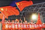 圖為日前在阿拉伯聯合酋長國舉行的第44屆世界技能大賽開幕式上,人們揮舞著中國國旗歡迎中國代表團入場。