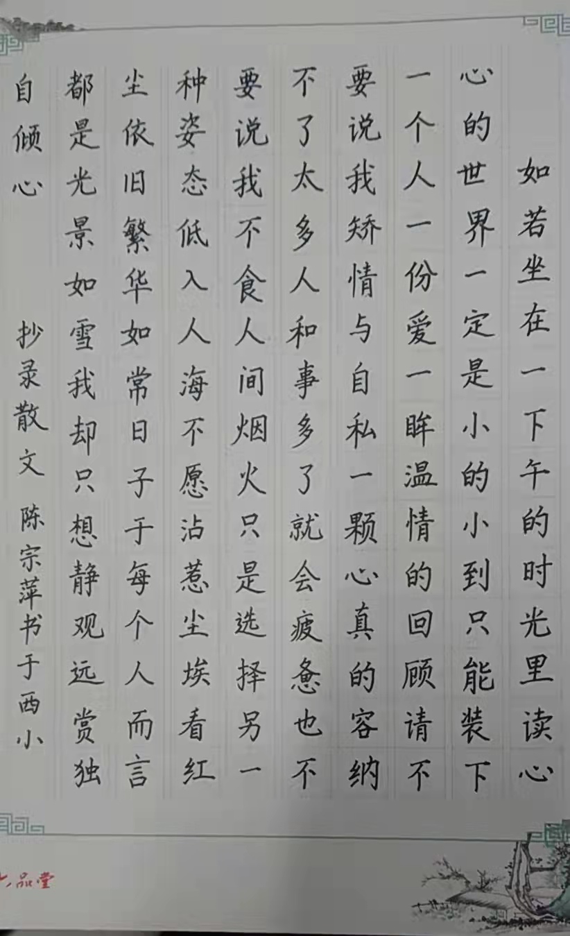 本次教師基本功大賽比賽內容為“三筆一畫”,即硬筆字、粉筆字、毛筆字和簡筆畫。其中硬筆書寫內容為教育方針,粉筆和毛筆書寫內容為古詩《靜夜思》,簡筆畫內容不限,自行創作。比賽現場,老師們聚精會神地書寫,專心致志的繪畫,墨香蕩漾著整個校園。鋼筆的一筆一畫中規中矩,結構和諧,彰顯字如其人的道理;板書則美觀大方,橫豎撇捺折,筆鋒掠過,一股明麗清新之氣撲人眉宇;簡筆畫勾畫了了,像簡明、得體、通俗的語言,傳達著富有感染力的情愫。