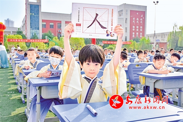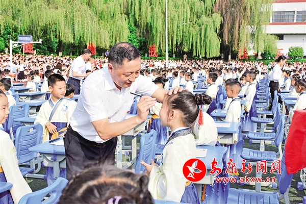 為傳承中國傳統文化,進一步加強學生文明禮儀教育,日前,安康高新區第一小學舉行一年級新生開筆禮及優秀學生表彰活動。千名一年級蒙童身著漢服,由班主任帶領跨過啟蒙門,正衣冠、感恩鞠躬、朱砂啟智、擊鼓明志、開筆啟蒙,接受中國傳統文化的洗禮,領略傳統文化的魅力。(張凌云 攝)26y安康新聞網