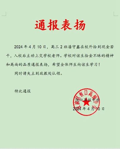 該校對潘守鑫同學拾金不昧的善舉進行了表揚,并號召全校師生學習這種拾金不昧的精神,充分發(fā)揚中華民族的傳統(tǒng)美德。FY3安康新聞網