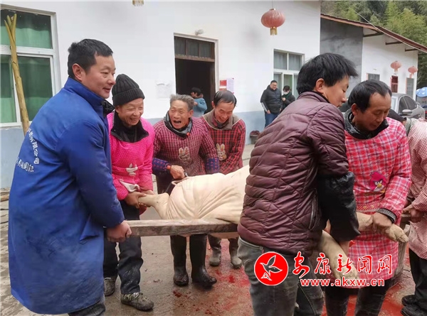 五組村民余美軒當天要宰殺6頭年豬,除了留1頭自己食用外,其余5頭早就被人預定,客戶一早就來到他家等候。余美軒家有4口人,屬一般脫貧戶,兒子有時在外打零工,生豬主要用自己種植的玉米、紅薯、洋芋,加上紅薯藤和一些青草菜葉喂養,平時只需要購買了少量飼料。通過一年辛勤喂養,每頭豬大約有200斤肉,售價4000余元,靠養豬他們今年就有2萬余元的收入。PxT安康新聞網