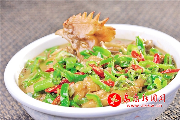 辣椒是農家自產的時蔬,魚是嵐河水孕育出的鮮魚,皆是原生態(tài)無公害食品。一個鮮綠,一個鮮嫩,色香味美,佳偶天成。