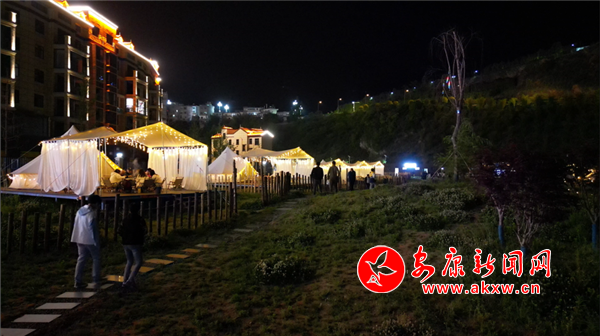 假期第一天,記者來到位于城關鎮羅景坪社區的嵐谷森野露營基地,只見藍天白云下,統一的白色帳篷在寬敞的草地上依次排開,游樂設施散布其間,人們或躺或臥,或游戲或拍照,一派快樂、安逸的假日氛圍。夜幕降臨,點點彩燈為夜晚的露營基地增添了一抹童話色彩,大家吹著徐徐晚風,吃著各色美食,享受著與家人朋友暢談暢飲的歡樂時光。