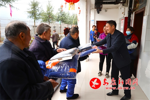 縣民政局局長柯玉俠向老人發放換季衣物。
