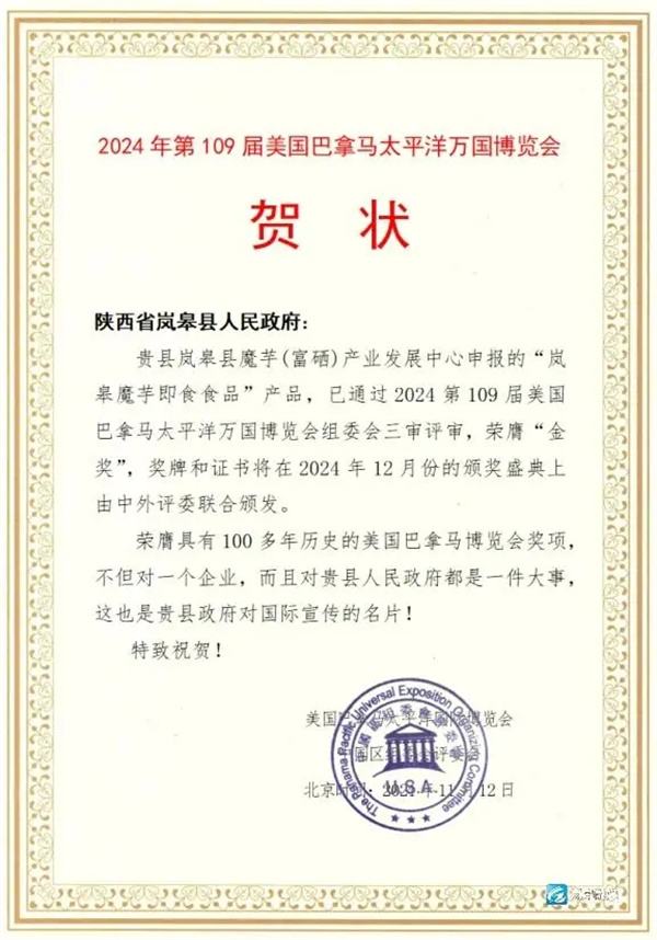 1月8日,筆者從泰國曼谷舉行的2024年第109屆美國巴拿馬太平洋萬國博覽會頒獎盛典上獲悉,由嵐皋縣魔芋產業發展中心申報的“嵐皋魔芋即食食品”,榮膺2024年第109屆美國巴拿馬太平洋萬國博覽會“金獎”。svM安康新聞網