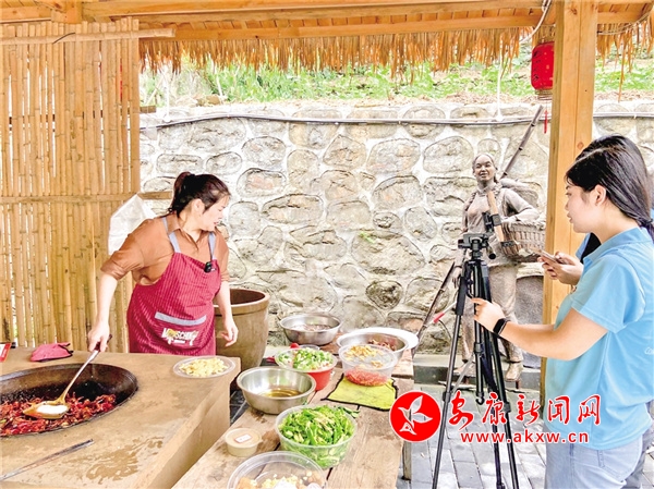 “大家好,我是三翠姐,今天我給大家炒一個嵐皋特色美食——酸辣魔芋豆腐!它酸辣鮮香,嫩滑爽口,富含豐富的膳食纖維……”在嵐皋縣四季鎮楊家院子非遺作坊小院……
