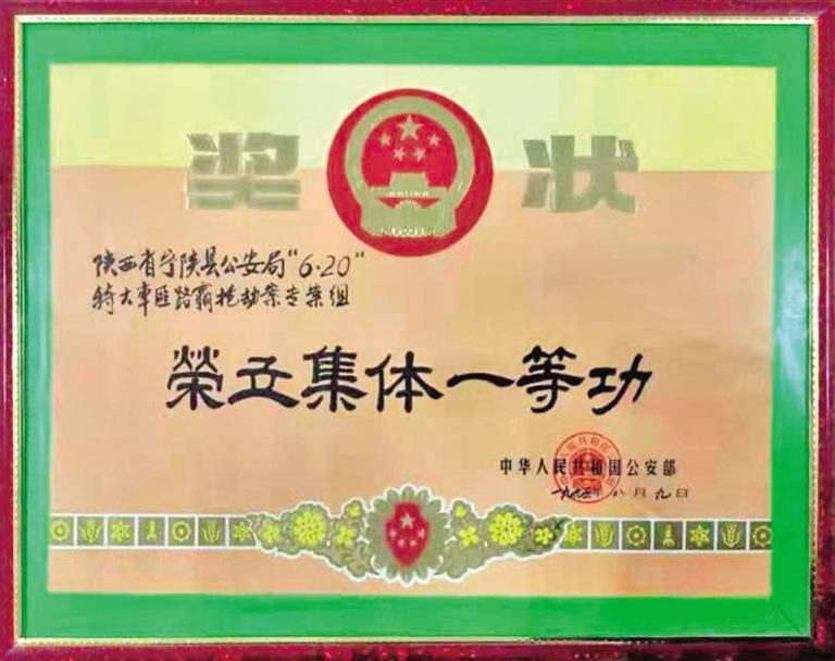 和往常一樣,我正和管理檔案的陳姨一起整理資料,忽然被眼前一塊榮立集體一等功的獎狀吸引,仔細查看,發現上面的詳細內容是:陜西省寧陜縣公安局“6.20”特大車匪路霸搶劫案專案組榮立集體一等功,落款是中華人民共和國公安部,時間是1995年8月9日。