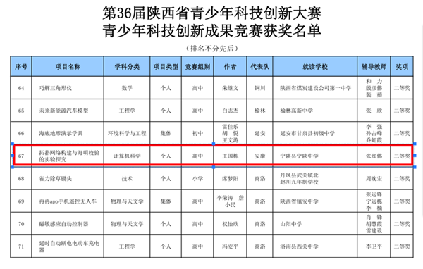 據悉,陜西省第36屆青少年科技創新大賽由省科協、團省委、省婦聯共同主辦。大賽分青少年科技創新成果競賽、科技輔導員創新成果競賽、青少年科技實踐活動、青少年科技創意比賽、少年兒童科學幻想繪畫比賽等五個類別。全省高中組青少年科技創新成果競賽共評出108個獎項,其中一等獎9項,被推薦參加全國大賽僅7項。我校兩名學生的科技創新項目榮獲一等獎,并拿到參加全國大賽通行證實屬不易,彰顯了學校科技創新特色發展的強大實力。