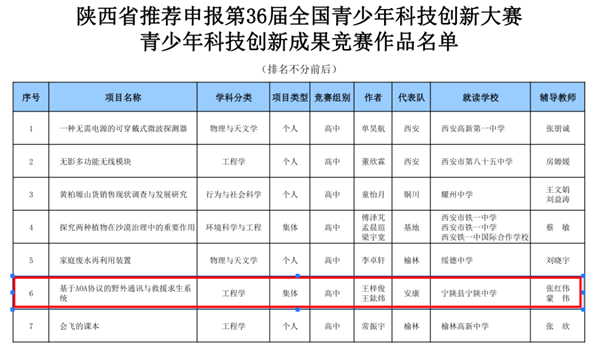 本網訊(通訊員 李小杰)日前,陜西省第36屆青少年科技創新大賽獲獎名單公布,寧陜中學申報的4項科技創新成果全部獲獎,其中:高二(2)班王梓俊、王鈜偉同學的《基于AOA協議的野外通訊與救援求生系統》項目榮獲一等獎,并被推薦參加全國第36屆青少年科技創新大賽,又一次入圍全國大賽。高二(5)班學生王國棟的《拓撲網絡構建與海明校驗的實驗探究》榮獲二等獎、高三(4)班學生段永橘的《全球日期變更演示模型》榮獲三等獎、高三(4)班學生沈子怡的《快速軟化獼猴桃的“妙招”》榮獲優秀獎。獲獎項目涵蓋工程學、計算機科學、地理學和植物學等多學科領域。